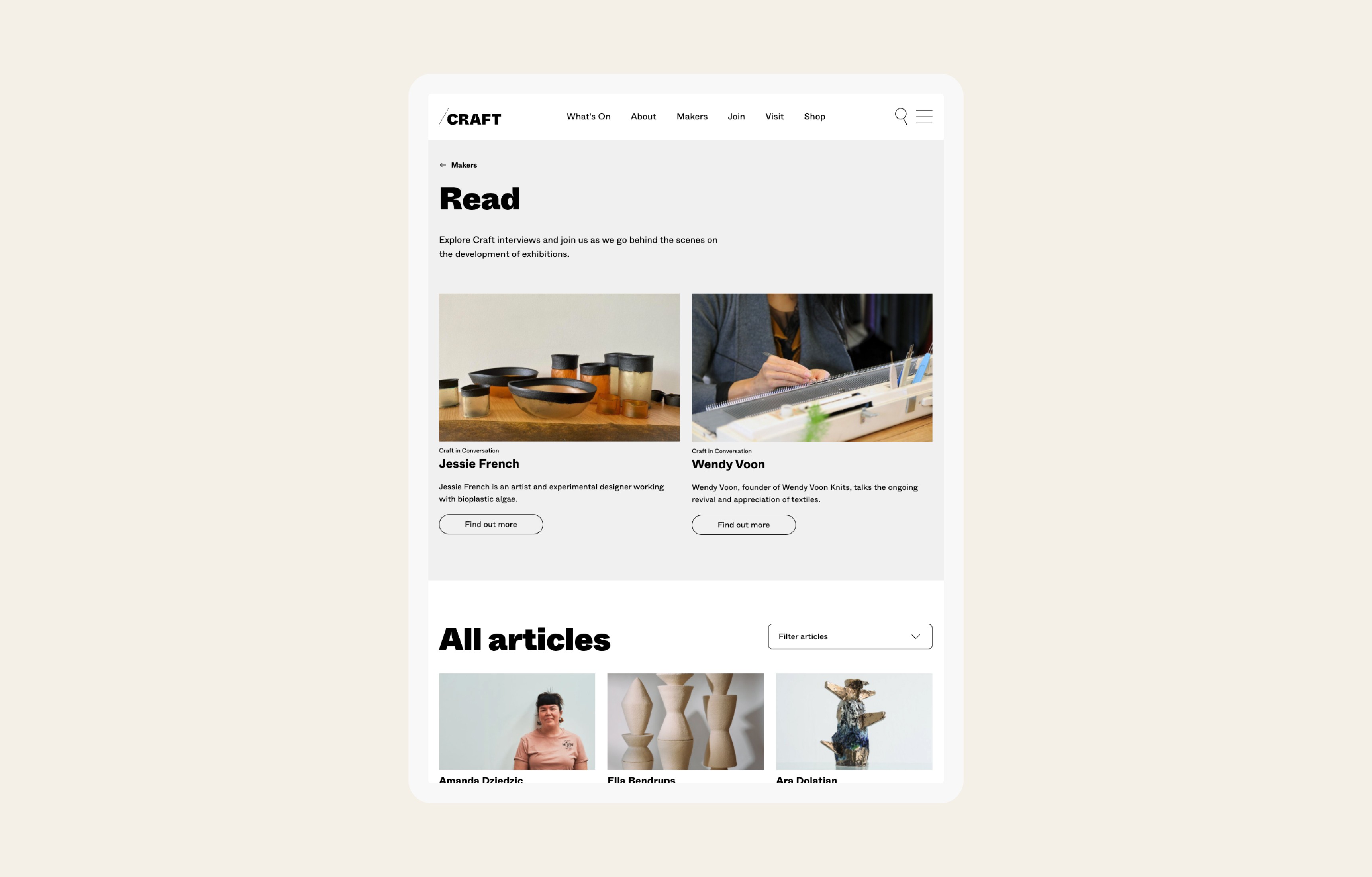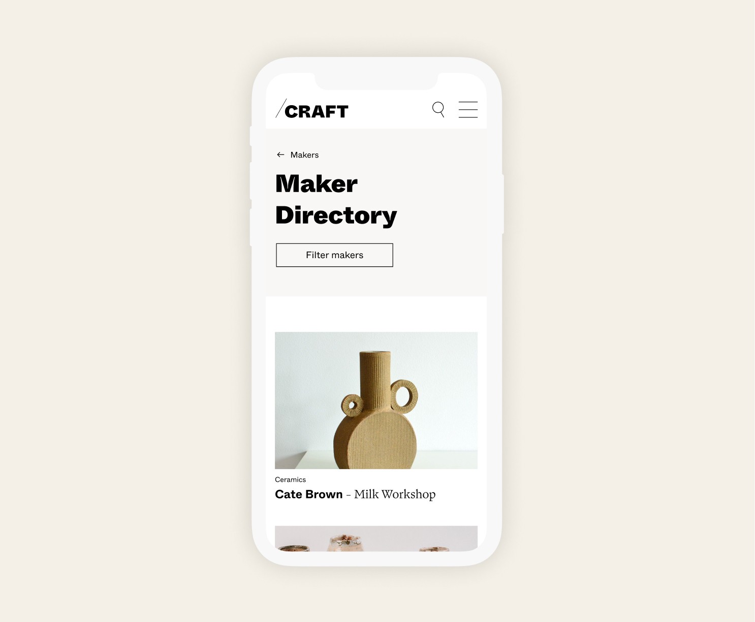 We carefully considered how to meet the expectations of highly engaged makers to have an intimate digital space for their work, without alienating more casual audiences. We also reconciled the different needs of novice makers to expert craftspeople, and thought about how we could achieve a cutting-edge website and dynamic content without burdening the small Craft team with a huge maintenance workload.